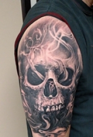 男生大臂上黑色点刺抽象线条骷髅纹身图片