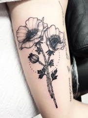 女性右手大臂膀上漂亮的花朵和僵尸女人纹身图片