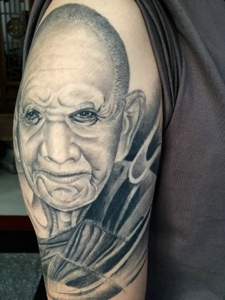 大臂一枚老奶奶肖像纹身图案很精致