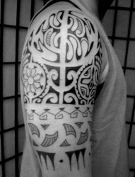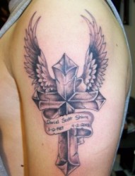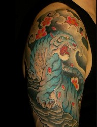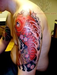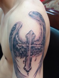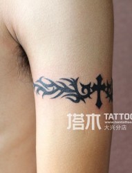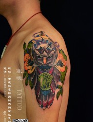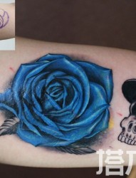 女孩大臂内侧玫瑰花遮盖纹身骷髅纹身