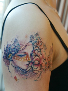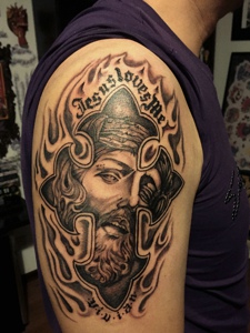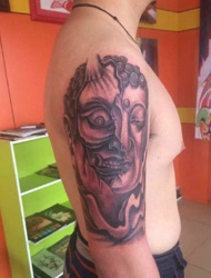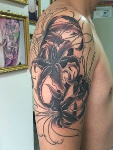 啤酒肚突出男士大臂上的红鲤鱼纹身