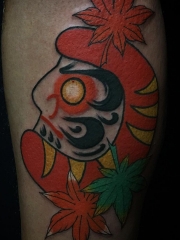 小腿枫叶达摩头像纹身图案