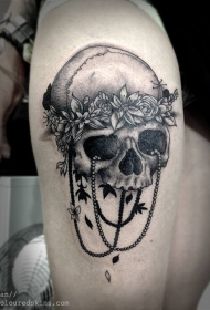 大腿令人难以置信的黑色骷髅与花朵珠宝纹身图案