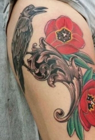 大腿old school黑色乌鸦与红色花朵纹身图案