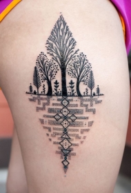 大腿黑色树纹身与点刺几何饰品纹身图案