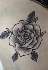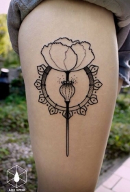 大腿黑色线条点刺女人肖像与花朵纹身图案