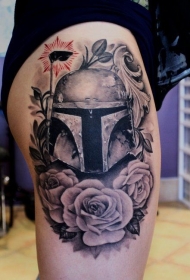 大腿有趣的黑色武士头盔与玫瑰纹身图案