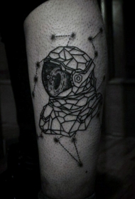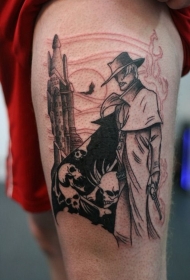 大腿漫画风格黑白神秘男子手枪纹身图案