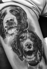 非常逼真的黑白微笑狗肖像大腿纹身图案