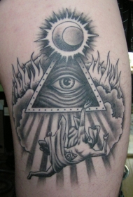大腿黑色点刺神秘的几何符号眼睛纹身图案