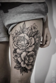 大腿性感黑白玫瑰纹身图案