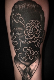 黑白神秘肖像和花卉大腿纹身图案