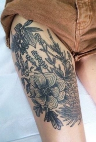 优雅的黑色蕾丝吊带袜大腿纹身图案