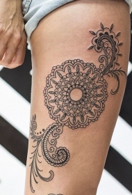 大腿黑色曼陀罗花和粉红桃花纹身图案