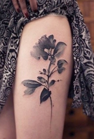 大腿黑灰色白天鹅和玫瑰纹身图案