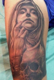 大臂逼真的红玫瑰和骷髅梵花纹身图案