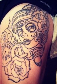 大腿黑色线条女郎和玫瑰时钟纹身图案
