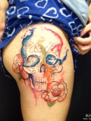 大腿蛇与匕首翅膀骷髅个性纹身图案