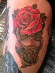女性性感大腿上的黑色玫瑰花朵和骷髅头纹身