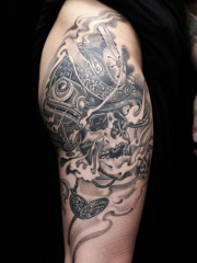 大腿上的骷髅头三眼老虎和上帝之眼纹身