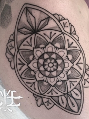大腿欧美老虎花卉宝石黑灰纹身图案