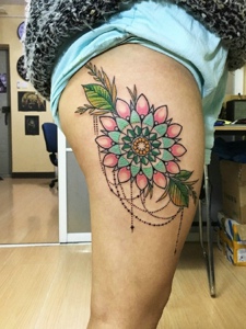 女性大腿上漂亮的线条轮廓水彩花卉纹身图片