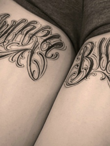 性感女生双大腿有着花体英文纹身图片
