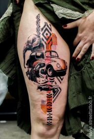 大腿old school女郎和蝴蝶面具水墨纹身图案