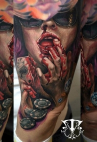 大腿彩色血腥女人肖像与蝴蝶纹身图案