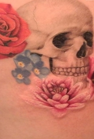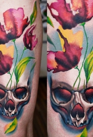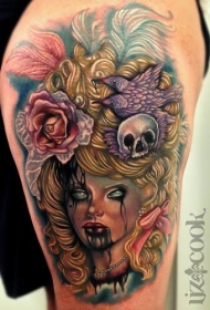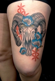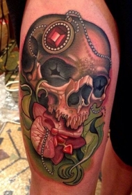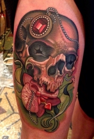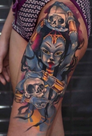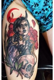 腿部新风格的魔鬼女人花和头骨纹身图案