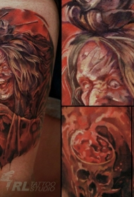 女性腿部令人惊叹的恶魔头骨纹身图案