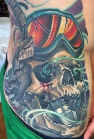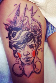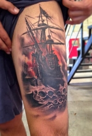 腿部原始组合大鲨鱼口中帆船纹身图案