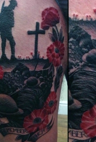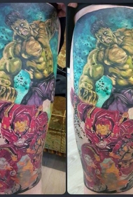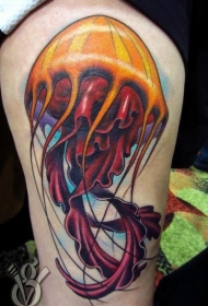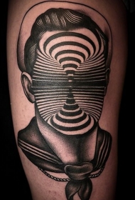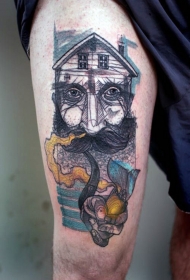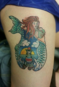 腿部复古风格的彩色美人鱼肖像纹身图案