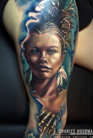 腿部现实主义风格的彩色印度女子肖像纹身