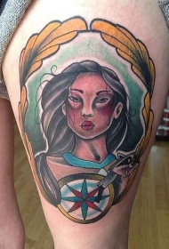 腿部彩色印度妇女与指南针纹身