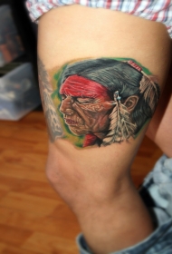 腿部新学校风格彩色印第安人肖像纹身