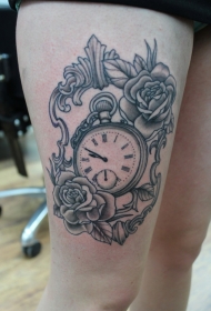 腿部彩色滑稽的不倒翁与开花的树纹身