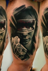 腿部新风格逼真的玫瑰花与女子纹身