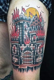 大腿old school老式的彩色城堡火灾纹身图案