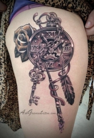 腿部现实主义风格的钥匙和时钟纹身图案
