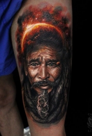 大腿彩绘智慧老者与大行星纹身图案