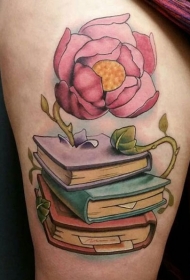 大腿彩色幻想花与书籍程式化纹身图案