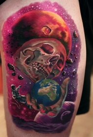 大腿彩色太空人类头骨与行星纹身图案