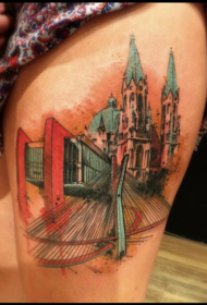 大腿令人印象深刻的大教堂纹身图案