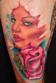 钢笔画风格彩色女生肖像和狼剪影纹身图案