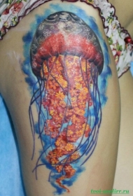 大腿逼真的彩色水母程与花朵组合纹身图案