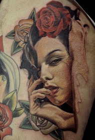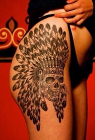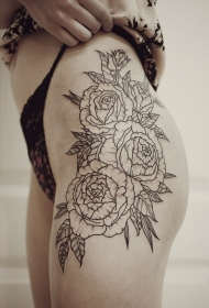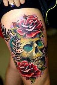 大腿油画风骷髅与逼真的玫瑰纹身图案