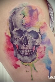 大腿彩色泼墨风格的骷髅纹身图案