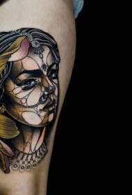 大腿素描风格黑色线条女人与骨架花朵纹身图案