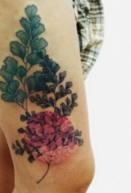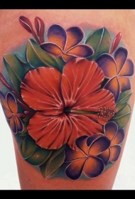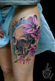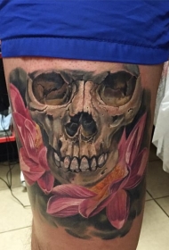 大腿写实风格彩色骷髅与美丽的花朵纹身图案